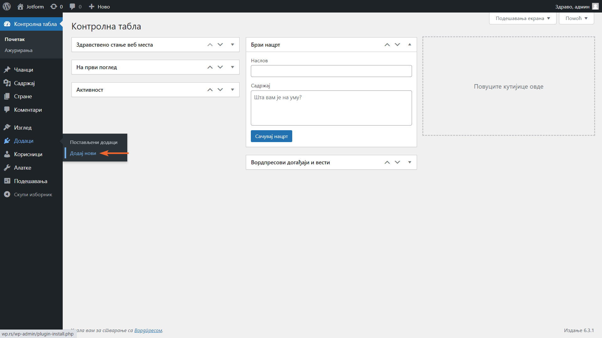- У главном менију са леве стране одабери Додаци, па кликни на Додај нови.