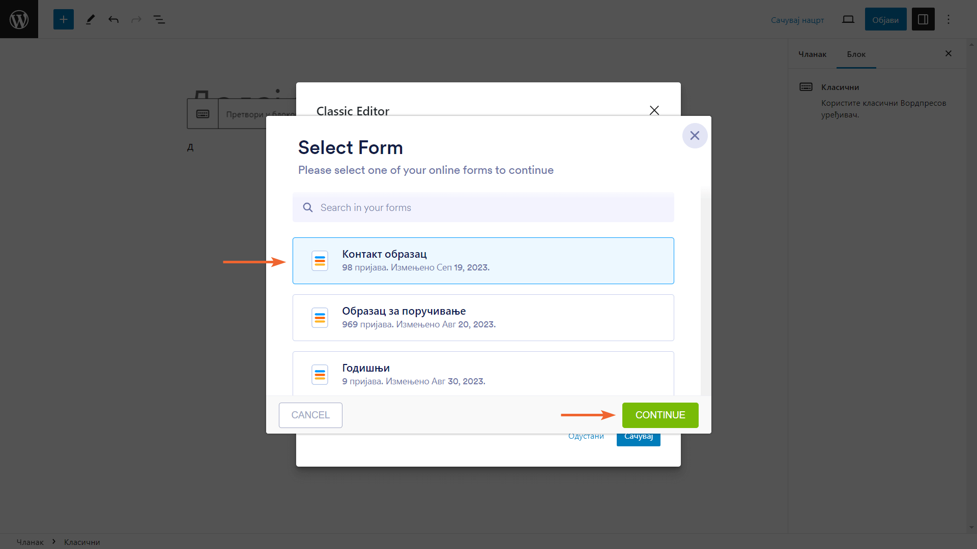 - На крају, одабери свој образац у искачућем прозору и кликни на Настави.