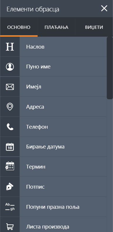 ПОЉА ЗА ПЛАЋАЊЕ: Ова поља ти дозвољавају да сакупљаш уплате кроз разне интеграције за плаћања. Овде можеш наћи комплетну листу свих доступних интеграција које нудимо. Уколико ниси сигуран која интеграција је најбоља за тебе, прочитај наш чланак о томе како пронаћи најбољи систем за плаћање за твој посао.