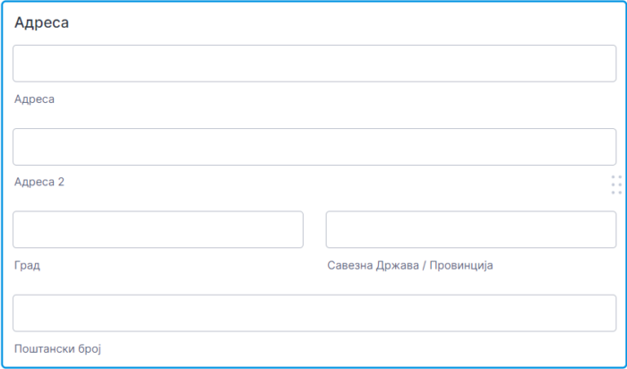 АДРЕСА: Дозвољава корисницма унос комплетне адресе са предефинисаним пољима.
