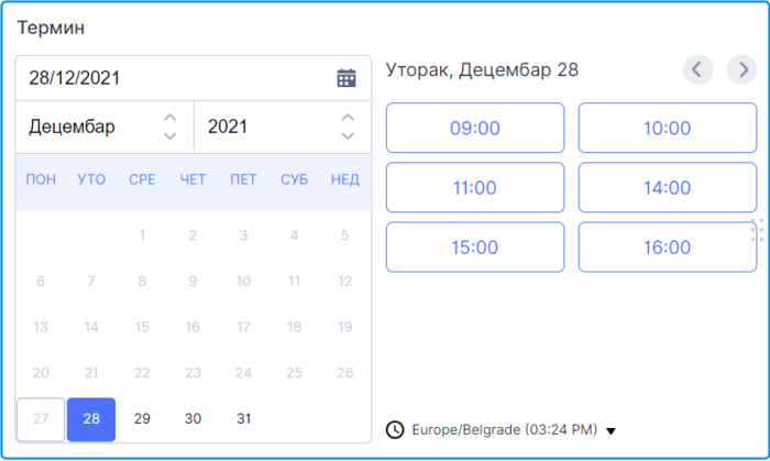ТЕРМИН: Дозвољава ти да дефинишеш термине које корисници могу да одаберу. Можеш да дефинишеш да ли термин може да одабере једна особа, или више њих. Можеш да сазнаш више о овом пољу на овом линку.