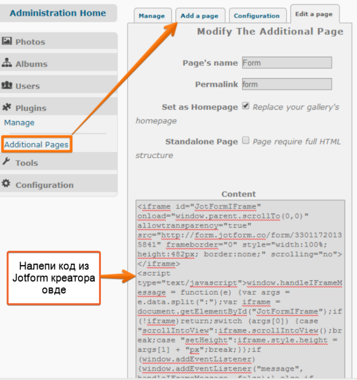 - Инсталирај Additional Pages додатак на свој Piwigo сајт како би могао додати стране и уградити образац.