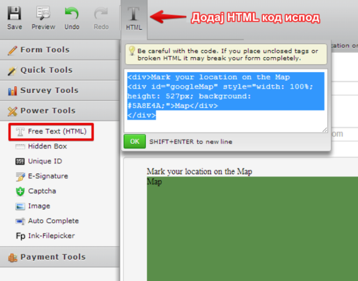 - Додај Free Text HTML поље на твој образац и убаци следећи HTML код.