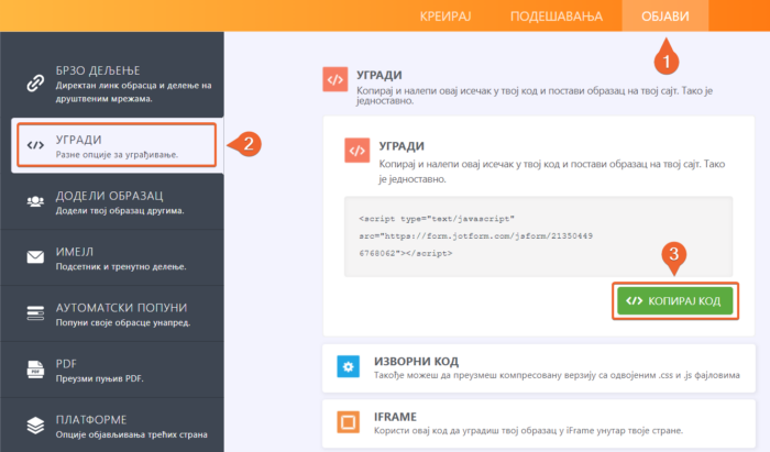 - Одабери начин ка који желиш да уградиш свој образац. Уколико ниси сигуран који метод да користиш, кликни овде да сазнаш разлику.