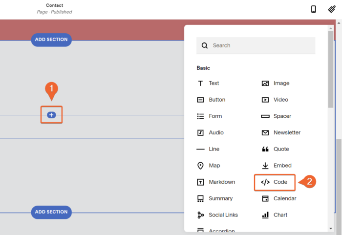 - Копирани код треба да додаш у Code блок на твојој Squarespace страни. Да видиш како да додаш блок, кликни овде.