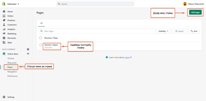 - Прво се пријави у свој Shopify налог и отвори Pages секцију.