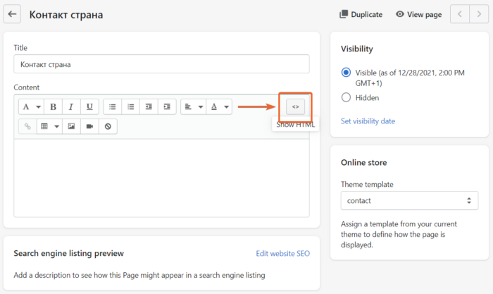 - Врати се на своју Shopify страну и кликни на Show HTML.