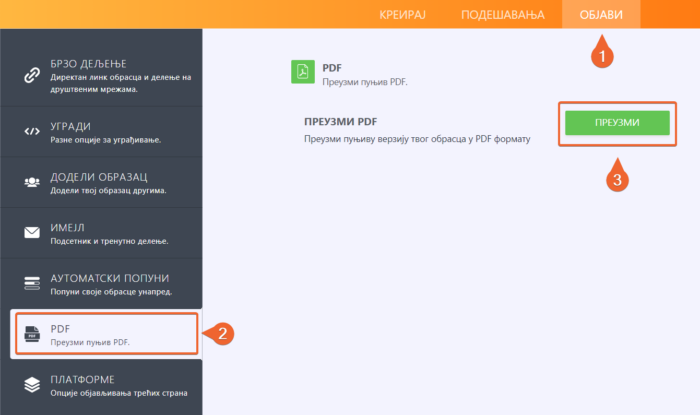 Да креираш PDF, све што треба да урадиш је да отвориш Објави картицу из креатора образаца, PDF из левог менија и на крају на Преузми.