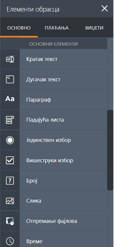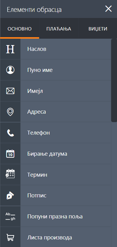 Образац садржи многа основна поља која се могу додати из креатора образаца.