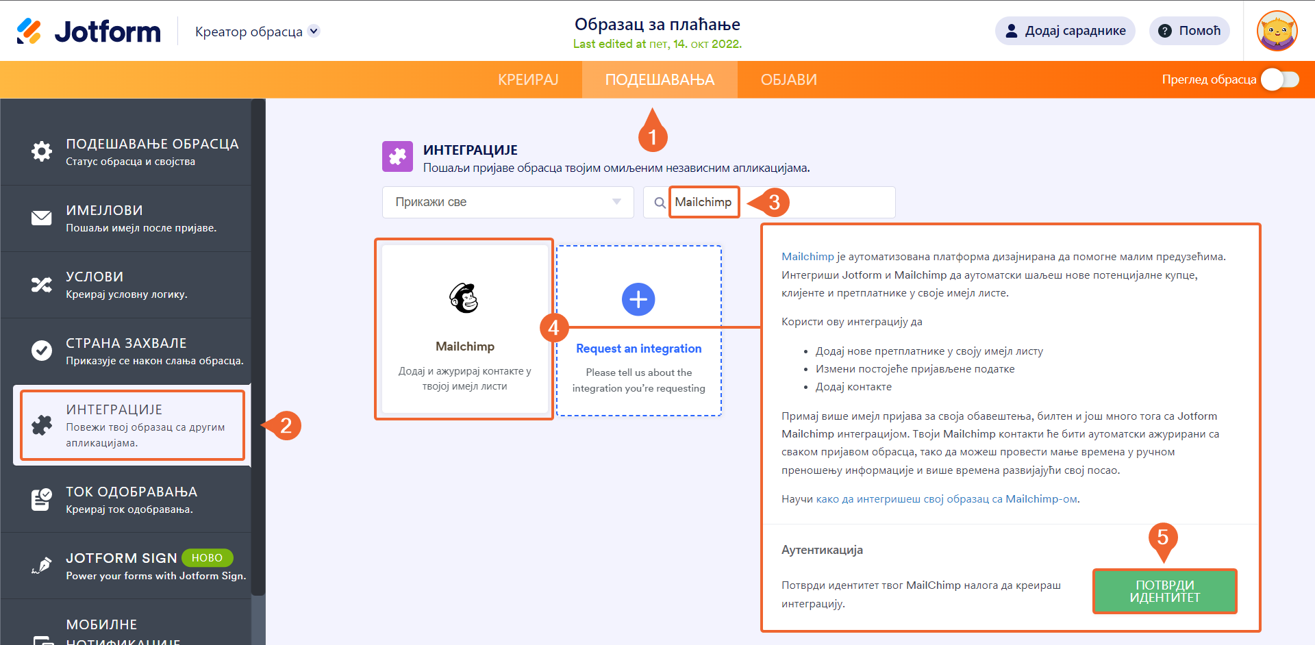 Белешка: Имејл је обавезно за Mailchimp листу, па не заборави да додаш имејл поље на свој образац.