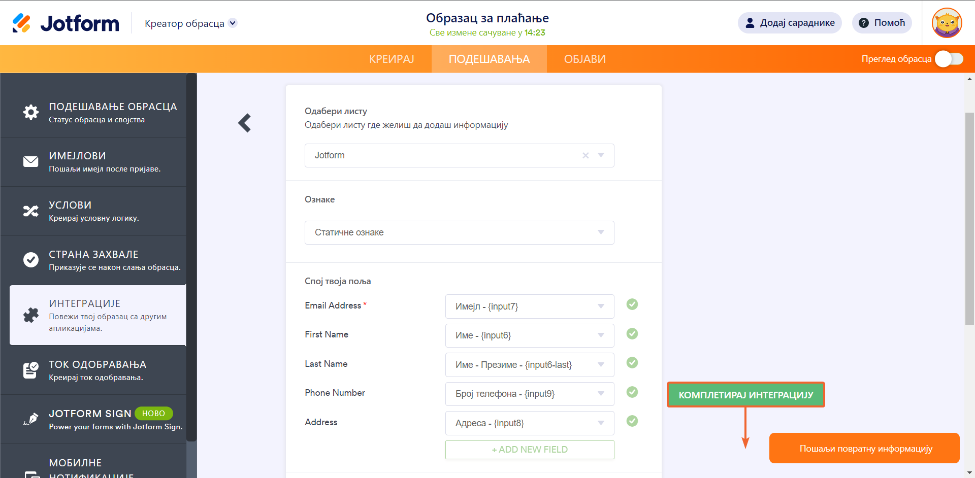 - На крају, кликни на Комплетирај интеграцију да сачуваш измене.