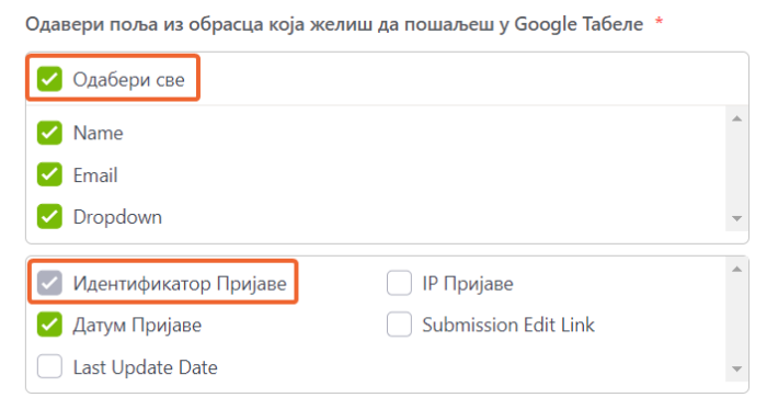 - Када обележиш Одабери све да пошаљеш сва поља обрасца у Google Табеле, свако поље обрасца које додаш у образац ће аутоматски креирати нову колону.