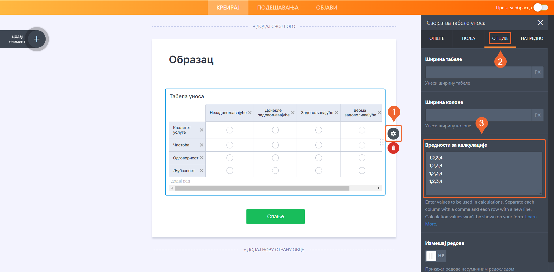 Табелу уноса можеш наћи у основној картици панела са елементима обрасца.