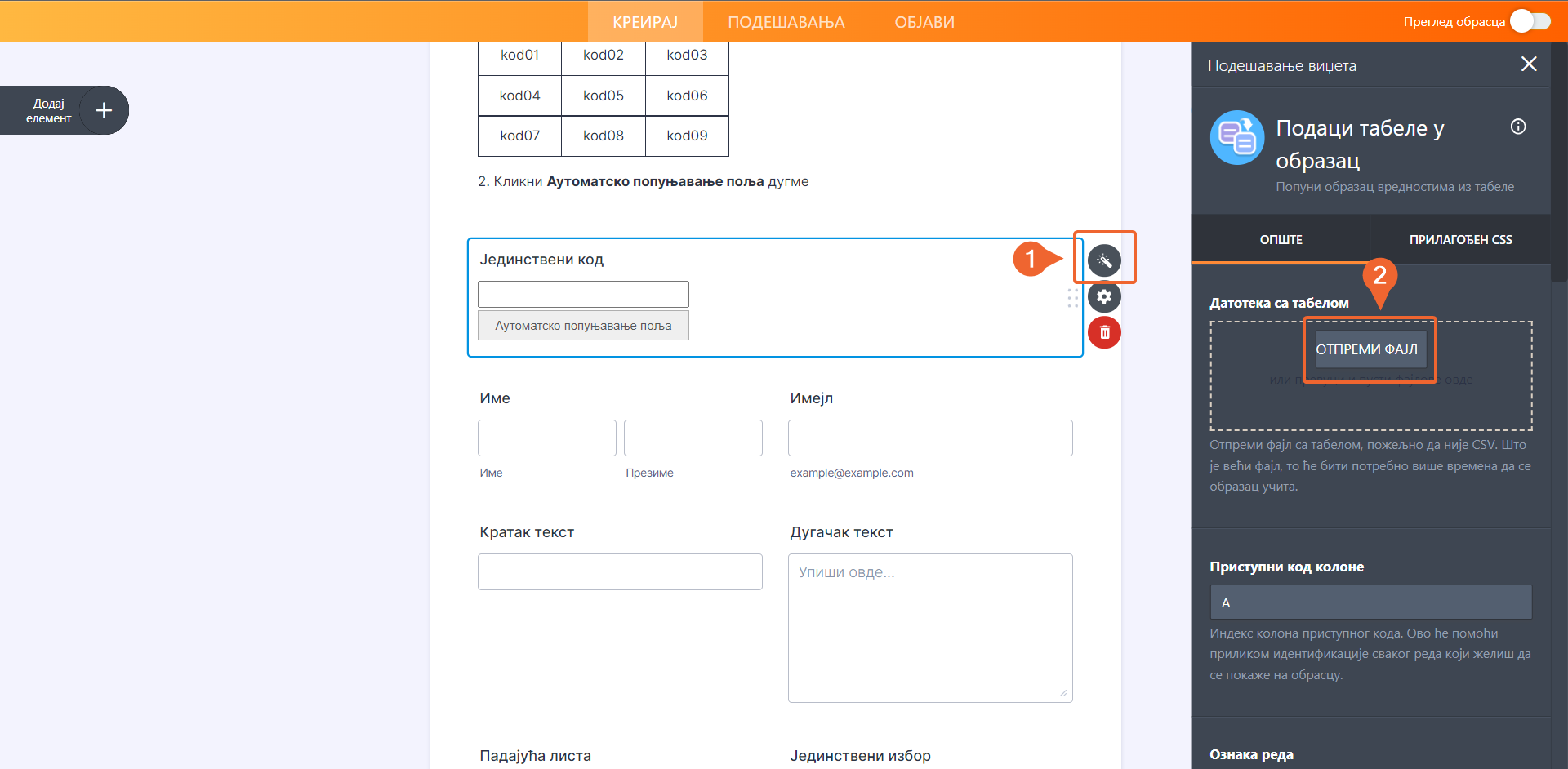 Индекс колоне са јединственим кодовима. Ово ће помоћи приликом идентификовања редова који требају да се појаве на обрасцу. Уколико је колона са јединственим кодовима у колони К у табели, упиши „К“ у ово поље.