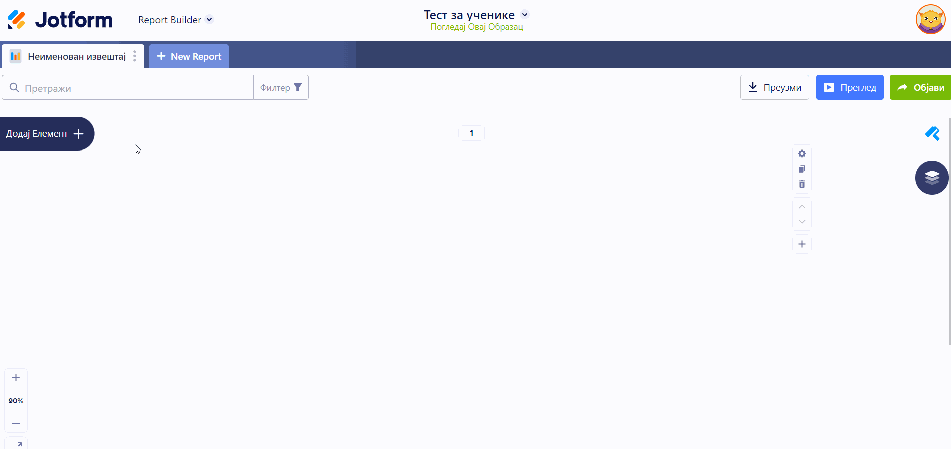 Мени за брзи приступ је доступан на свакој Jotform страни (Креатор обрасца, PDF Уређивач, Табела, Пријемно сандуче, Аналитика обрасца, Креатор извештаја). Кликом на Креатор извештаја из менија ће отворити Jotform Креатор извештаја.
