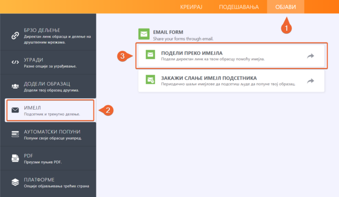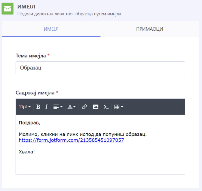 Jotform нуди једноставну опцију за слање имејла корисницима који садржи линк ка твом обрасцу.