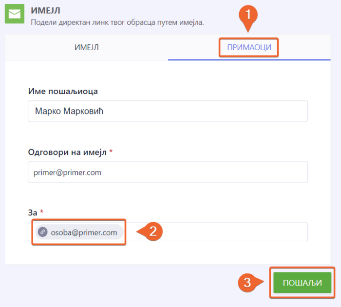 - Отвори Примаоци картицу и додај имејл адресе корисника којима би желео да пошаљеш образац. Такође можеш да подесиш Име пошаљиоца, као и имејл који ће бити кориштен за одговоре.