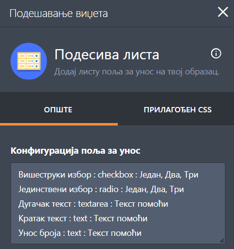 Започнимо са листом поља за конфигурисање