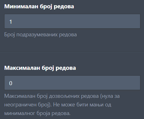 Унеси број у Максималан број редова да ограничиш број редова који може бити додат. 0 означава неограничено редова.