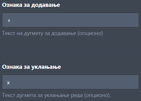 Да промениш текст дугмади (за додавање и уклањање редова), подеси их у следећим пољима: