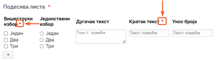 Поље за јединствени избор – омогућава бирање једне опције од више понуђених.