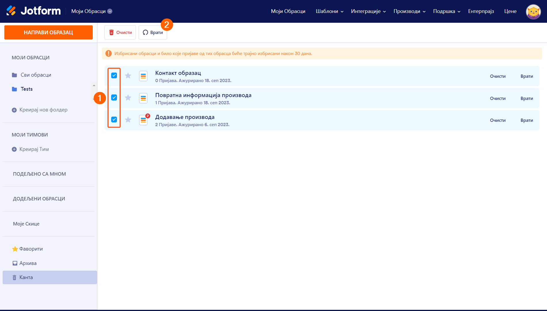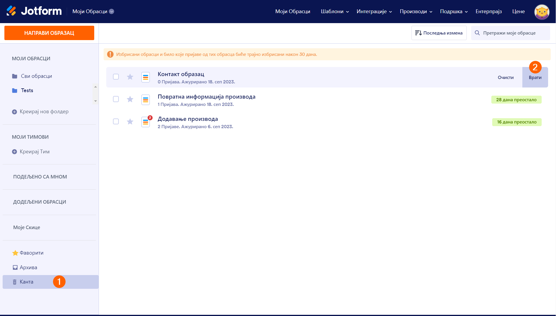 Систем аутоматски брише обрасце из канте након 30 дана. У овом случају, више их није могуће повратити. Такође није могуће повратити обрасце који се случајно трајно обришу из Канте.