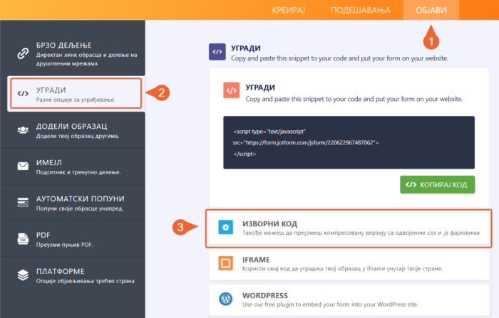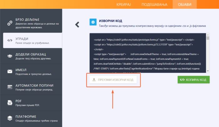 - Кликни на Копирај код дугме да копираш изворни код обрасца.