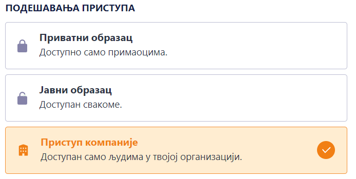 Можеш променити подешавања приступа из креатора обрасца. Ова опција ти дозвољава да ограничиш приступ твом обрасцу. Доступне опције су Јавни образац (подразумевана опција), Приватни образац, и Приступ компаније.
