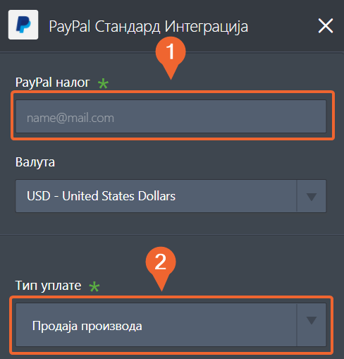 2. Унеси имејл адресу свог PayPal налога, и затим одабери Тип уплате. У овом примеру ћемо одабрати Продаја производа.