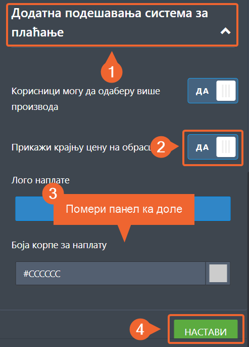 3. Прошири Додатна подешавања система за плаћање и подеси Прикажи крајњу цену на обрасцу на „Да“. Затим помери панел ка доле и кликни на Настави да сачуваш измене.
