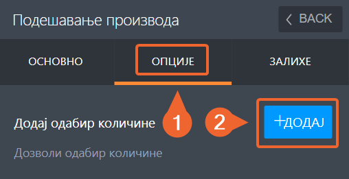 2. Scroll down and click the Add button on the Add a Quantity Selector section. Из картице Опције одабери Додај поред Додај одабир количине.