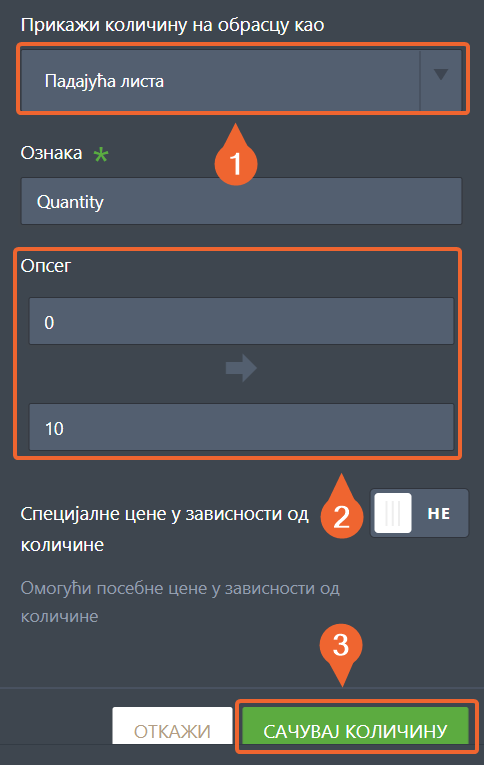 3. Select “Dropdown” or “Textbox” on the Show Quantity on the Form as option. Set your desired Label and Range, then click the Save Quantity button. Одабери Падајућа листа или Текстуални унос као опцију. Одабери жељену ознаку и опсег, и затим сачивај измене.