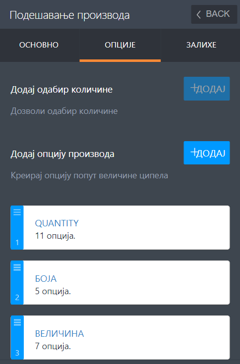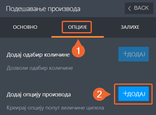 4. Click the Add button on the Add a Product Option section. Да додаш опције производа, кликни на Додај поред Додај опцију производа.