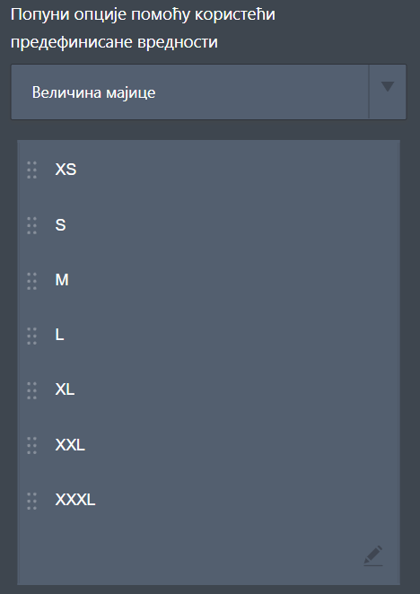 Уколико продајеш мајице, можеш питати кориснике за количину, боју и величину. Како би додали ово у наш пример, додаћемо ове опције.