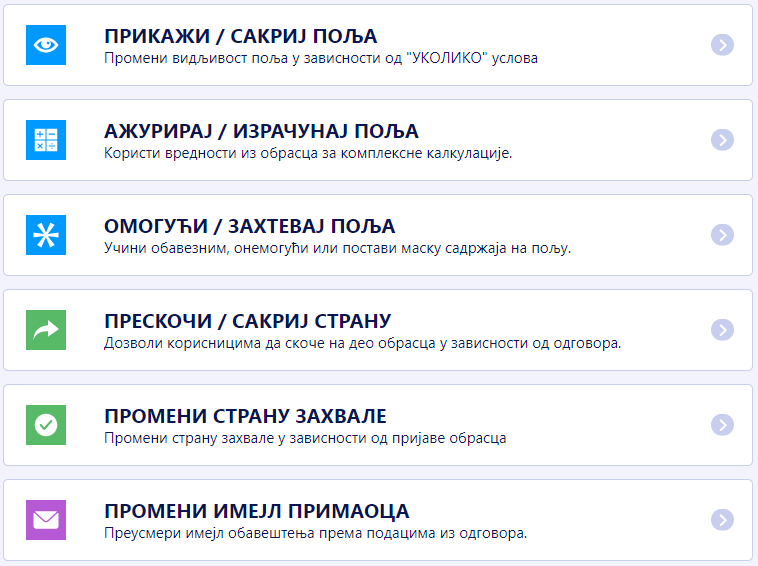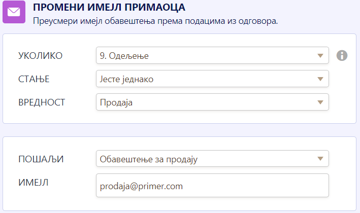 Подешавање услова је динамично. Поља која си додао и одабири које подесиш одређују уколико/затим поља. На пример: Уколико је одељење једнако са „Продаја“, затим ће имејл обавештење бити послато на prodaja@primer.rs.