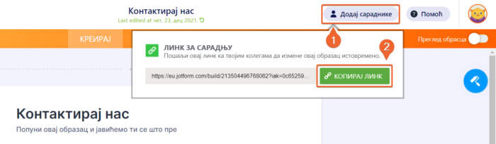 Да преузмеш линк, кликни на Додај сараднике иконицу на врху креатора обрасца. Затим копирај линк и подели га са другима. Да, толико је једноставно.