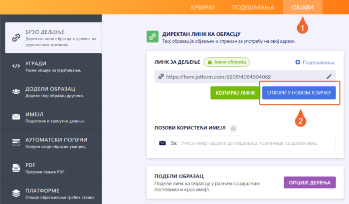 - Отвори картицу Објави и кликни на Отвори у новом језичку.
