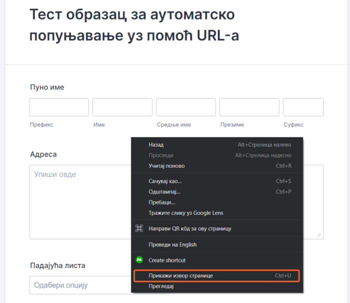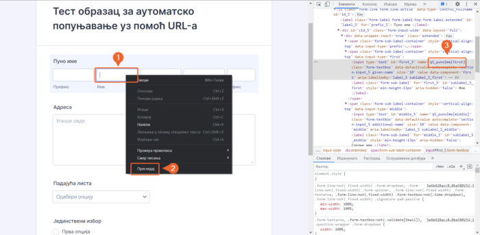 Алтернативно, можеш да користиш опцију за инспекцију елемента како би једноставније пронашао јединствено име поља. Кликни десни тастер миша на поље које желиш да попуниш и одабери Прегледај.