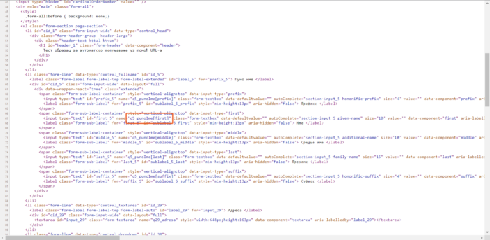 Сада смо у могућности да копирамо јединствено име поља које можемо додати у URL. Не заборави да додаш упитник ( ? ) након URL-а обрасца како би означили да следе додатни параметри. Затим следи име поља којег прати знак једнакости ( = ), и на крају долази вредност поља. Имај на уму да је потребно копирати вредност после доње црте ( _ ).