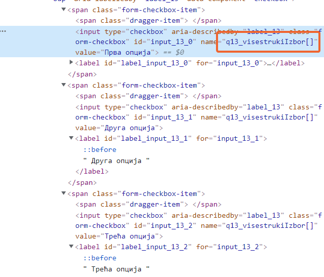 - Копирај име након доње црте ( _ ), на пример visestrukiIzbor[] и уклони угласте заграде ( [] )
