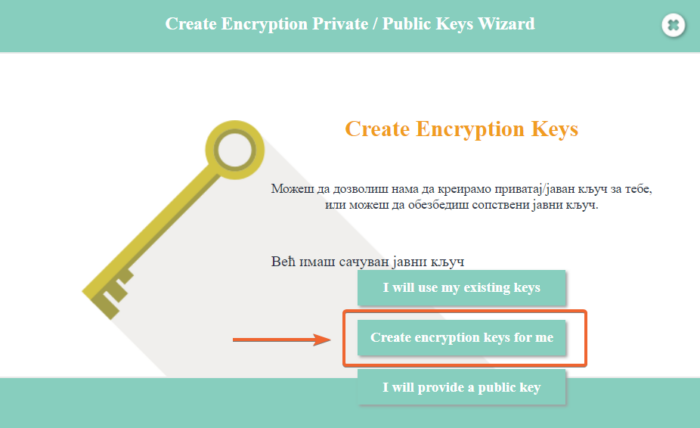 Након тога ћеш имати опцију да користиш постојећи приватни кључ (I will use my existing keys), да се кључ креира за тебе (Create encryption key for me) или да додаш сопствени приватни кључ (I will provide a public key). Објаснићемо све ове опције појединачно.
