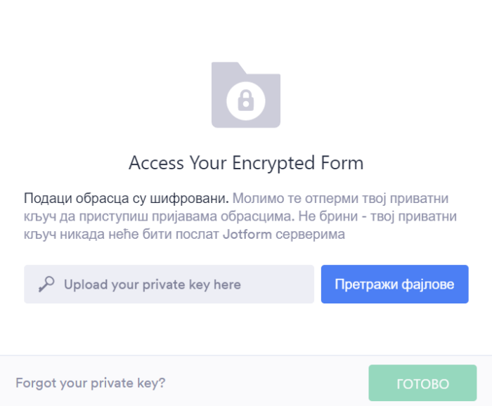 - Уколико је шифровање омогућено, али се од тебе не тражи да додаш свој приватни кључ, а подаци пријава нису читљиви, То значи да је погрешан приватни кључ сачуван у меморији твог претраживача. Тренутни приватни кључ можеш уклонити директно из Jotform табеле, одабиром Уклони привани кључ. Одмах након овога ће бити затражено бирање новог приватног кључа.