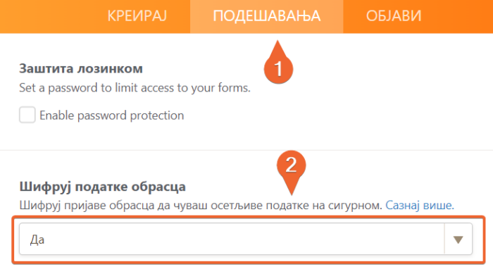 У креатору обрасца отвори Подешавања, затим кликни на Прикажи више опција и постави Шифруј податке обрасца опцију на Да.