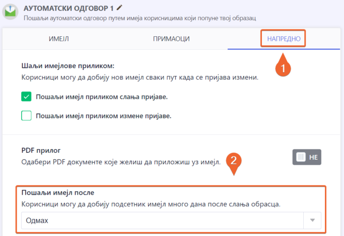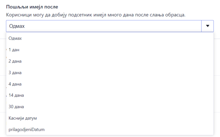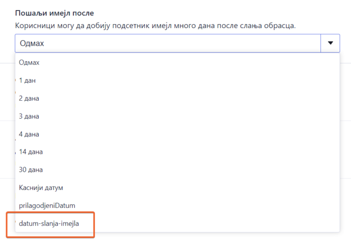 Слање аутоматског одговора одмах након што корисник пошаље образац можда не одговара у сваком случају. Можда желиш да обавестиш кориснике касније. Уколико, на пример, имаш образац за резервацију соба у хотелу, користећи ову опцију, можеш да пошаљеш имејл корисницима један дан пре него што се пријаве.