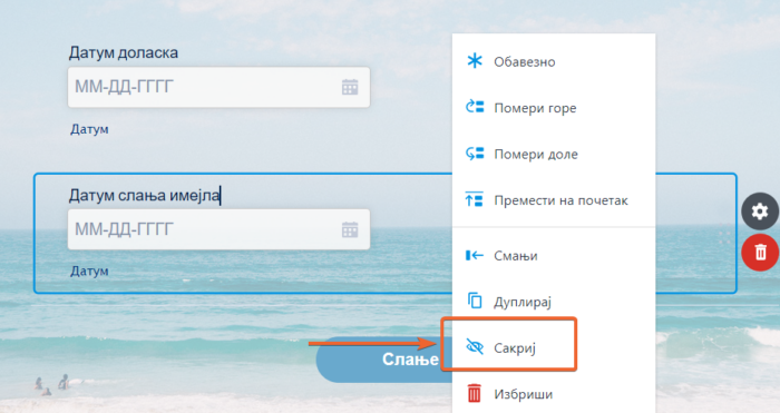Хајде прво да сакријемо ово поље обрасца. То можеш урадити тако што ћеш кликнуди десни клик на поље и одабрати Сакриј.