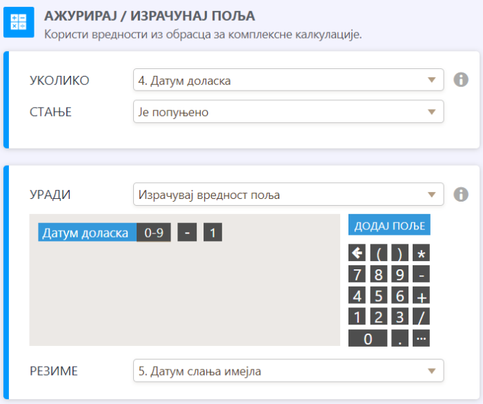 Након додавања услова, потребно га је конфигурисати. У примеру изнад: уколико је датум доласка (датум које је корисник одабрао) попуњено, датум слања имејла ће аутоматски бити израчунато тако што ће од датума доласка бити одузет 1 дан. Ово можеш прилагодити по својим потребама. На пример, уколико желиш да пошаљеш имејл 7 дана пре доласка, додај датум доласка – 7. У резиме је потребно одабрати Датум слања имејла, јер желимо да резултат сачувамо у ово поље.