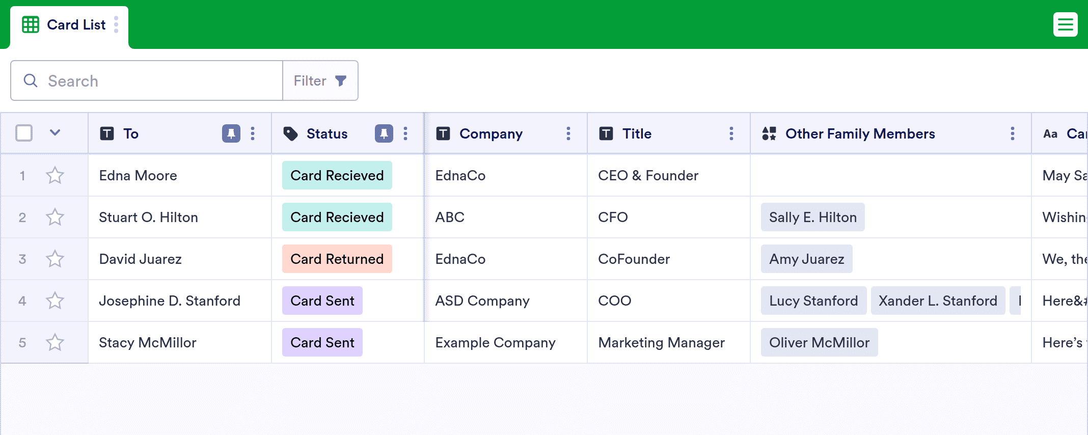 It’s beginning to look a lot like Christmas… card season! Whether your family participates in the time-honored tradition of annual Christmas cards or you manage partnerships for your company, our free online Christmas Card List Template is the perfect tool to help you send Christmas cards. All you have to do is enter contact information about each recipient and check whether or not you’ve sent them a card. You’ll be able to view your spreadsheet from any device, download it as a CSV, PDF, or Excel file, and print it for safekeeping in just one click.