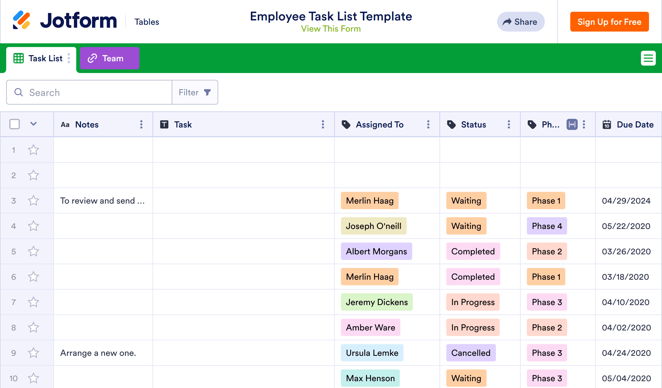 Add unique label colors for task statuses, put your deadlines into a calendar, or add new rows and columns to include new employees. It takes just a few clicks to customize this Employee Task List Template to your liking! No matter the size of the team you’re in charge of, using an online spreadsheet can help your team stay on track — so use Jotform’s free Employee Task List Template to manage employee tasks and boost productivity.
