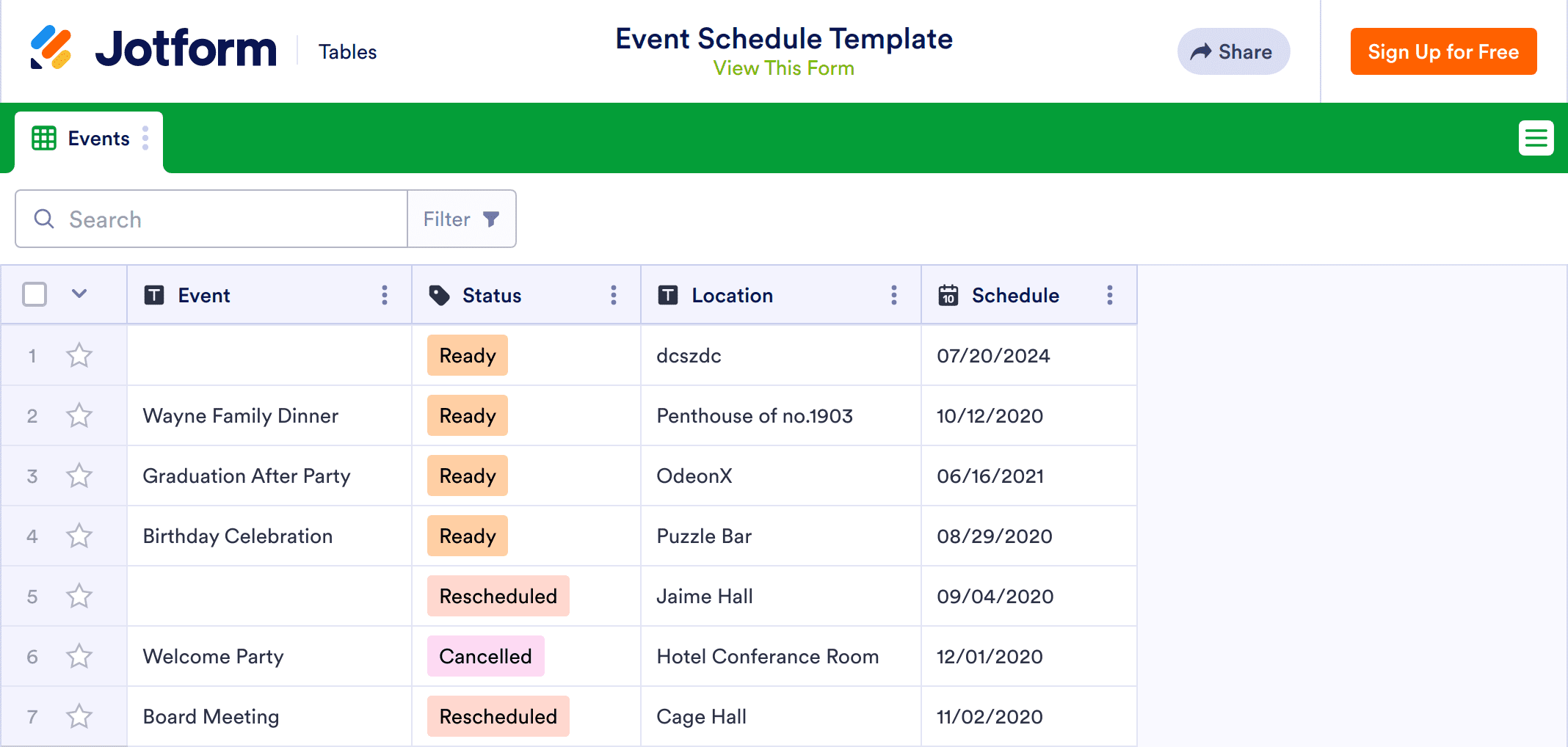 You’ve been hard at work making sure every detail of your event is perfect so why not do the same with your event schedule? Luckily, you can customize your Event Schedule Template in just a few minutes! Simply drag and drop to rearrange rows and columns, create new label names and colors, and even add new tabs for additional event details, guest information, and more. You can even switch it to calendar or card view to see your data in a way that works best for you. And when it’s ready to go, you can share your Event Schedule Template with event staff in just one click. Take the stress out of event planning with an easy-to-use Event Schedule Template!