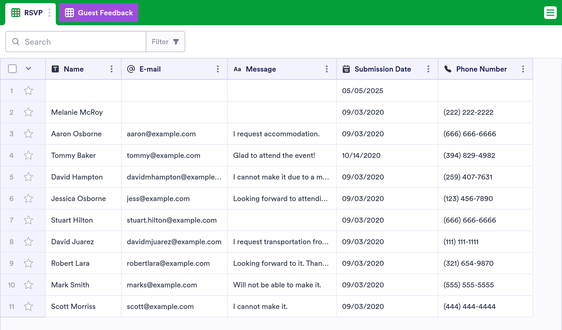 Get the party started with an online Guest List Template! Whether you’re hosting a party, corporate event, or family gathering, you can keep RSVPs and guest details organized in a professional online spreadsheet. Start by customizing this template to suit your needs — then fill out the attached attendance form to update your sheet with guest details automatically! All responses can be viewed or edited on any device or downloaded as a PDF, CSV, or Excel file.